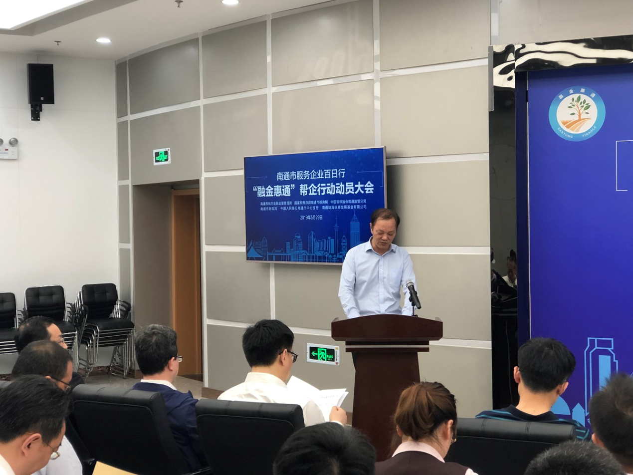 5月29日上午,南通市地方金融監(jiān)督管理局在市中小企業(yè)金融服務(wù)中心路演大廳召開“融金惠通”幫企行動(dòng)動(dòng)員大會(huì)。大會(huì)由南通市地方金融監(jiān)督管理局局長張乃華主持,南通市市委常委、常務(wù)副市長單曉鳴出席大會(huì)并致辭,南通產(chǎn)業(yè)控股集團(tuán)有限公司副董事長顧建國作為南通陸海統(tǒng)籌發(fā)展基金代表及“融金惠通”幫企行動(dòng)市直二分隊(duì)隊(duì)長進(jìn)行了表態(tài)發(fā)言。
