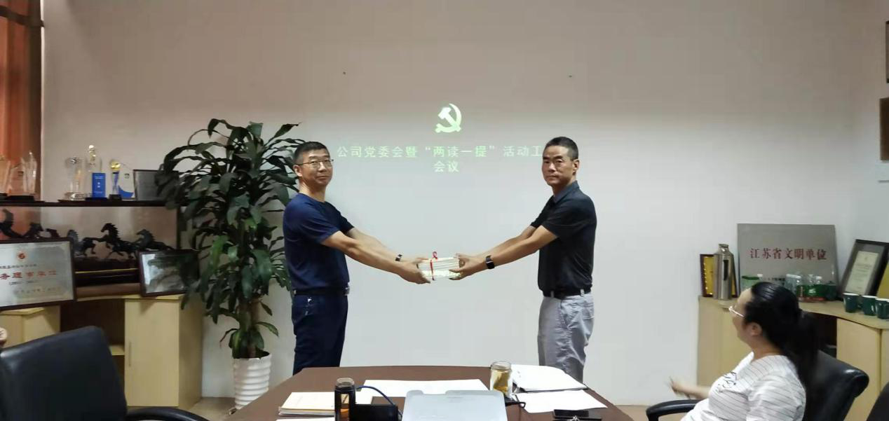 為進(jìn)一步推進(jìn)公司“不忘初心,牢記使命”主題教育開展,落實(shí)公司黨委“兩讀一提”活動(dòng)部署,促使黨員、干部養(yǎng)成良好讀書習(xí)慣,進(jìn)一步加強(qiáng)基層支部黨建工作建設(shè)、提升黨員、干部思想政治水平,8月22日下午,南通紡織控股集團(tuán)紡織染有限公司黨委組織開展了“紅色贈(zèng)書”活動(dòng)。公司黨委書記、董事長(zhǎng)李志宏、黨委副書記盧李星等出席活動(dòng)。 活動(dòng)中,李志宏同志分別向本部黨支部、崇天黨支部依次贈(zèng)送《習(xí)近平新時(shí)代中國(guó)特色社會(huì)主義思想學(xué)習(xí)綱要》《不忘初心·牢記使命專題十講》、《黨員發(fā)展對(duì)象培訓(xùn)教材(2019年版)》《國(guó)有企業(yè)紀(jì)檢監(jiān)察工作手冊(cè)》等書籍。其中《習(xí)近平新時(shí)代中國(guó)特色社會(huì)主義思想學(xué)習(xí)綱要》為全體黨員人手一本。